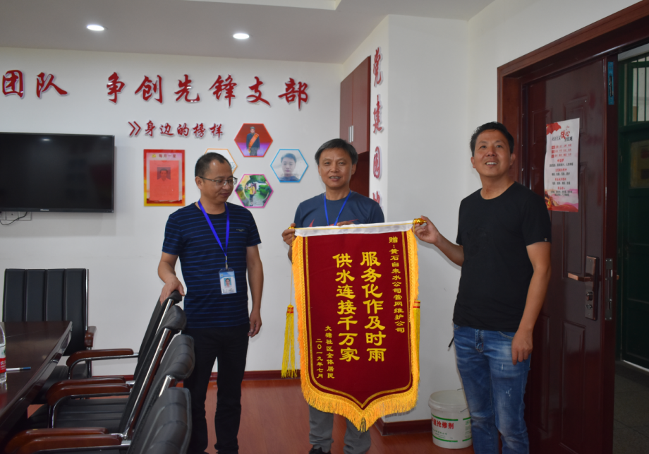 7月18日上午,下陸大塘社區(qū)及居民代表給黃石市自來水有限公司管網(wǎng)維護公司送來感謝錦旗——“服務(wù)化作及時雨,供水連接千萬家”,感謝該公司連續(xù)三天奮戰(zhàn)工地,解決用戶用水難問題。