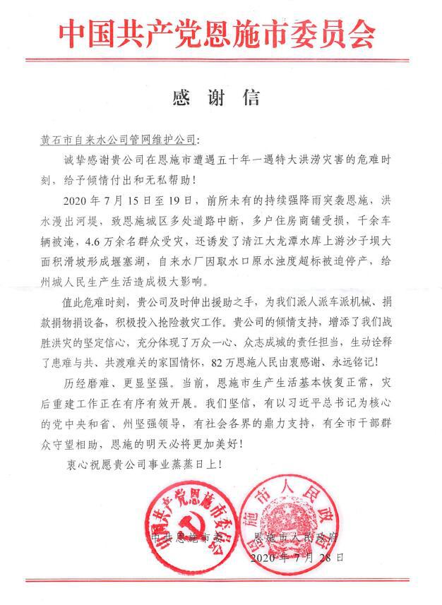 8月4日,一封由恩施市委、市政府聯(lián)合署名的感謝信寄到了黃石市自來水有限公司,感謝他們在前段時間恩施遭遇特大洪澇災(zāi)害之時的緊急援助。