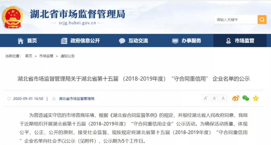 為營(yíng)造誠(chéng)實(shí)守信的市場(chǎng)營(yíng)商環(huán)境,今年,省市場(chǎng)監(jiān)督管理局組織開(kāi)展了湖北省第十五屆(2018-2019年度)守合同重信用企業(yè)評(píng)選活動(dòng),并進(jìn)行了名單公示。