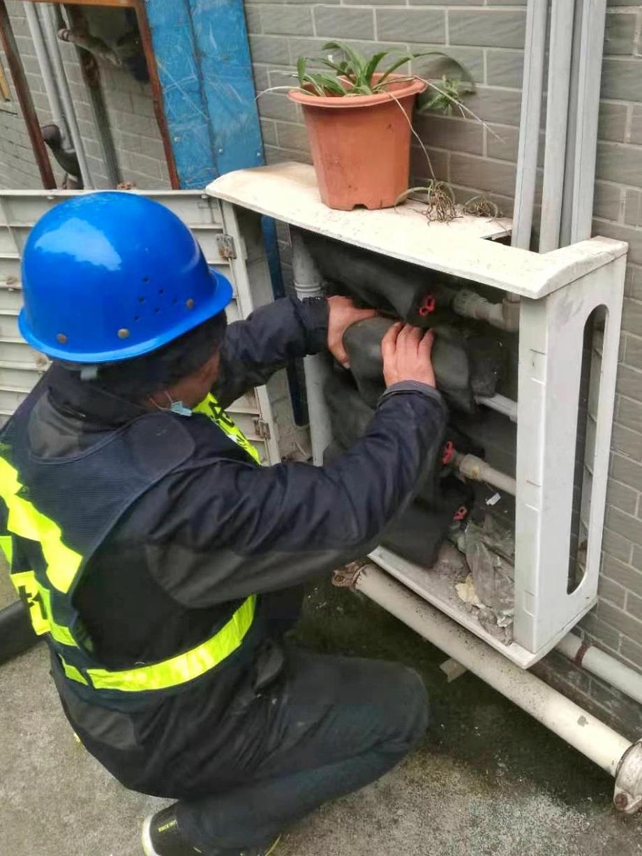 一群人細(xì)心地為水表包上保溫材料