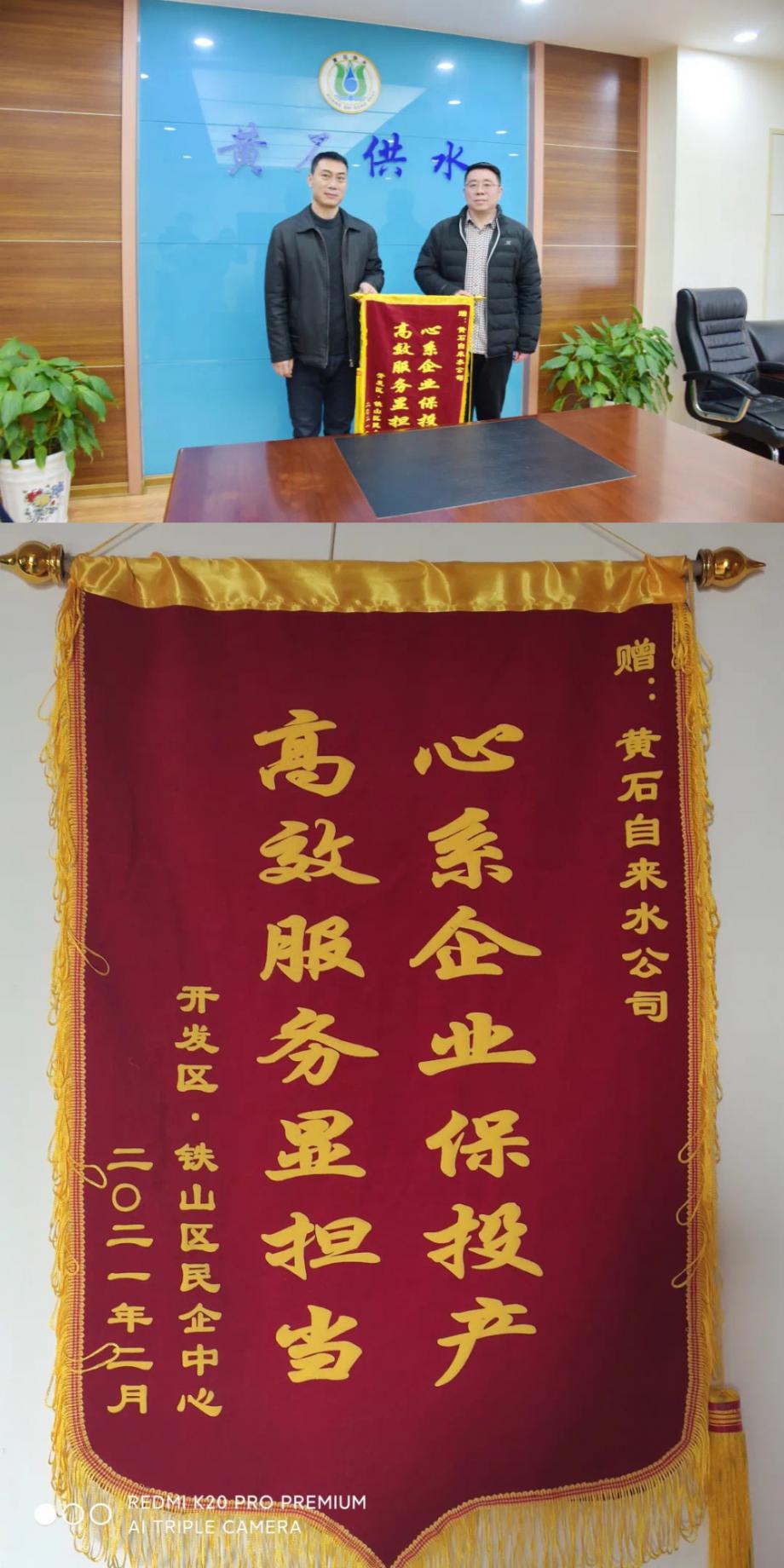 2月8日上午,開發(fā)區(qū)·鐵山區(qū)民企中心專程來(lái)到市自來(lái)水有限公司贈(zèng)送錦旗,對(duì)公司保障落戶企業(yè)用水,提供主動(dòng)作為、高效周到的服務(wù)表達(dá)謝意。開發(fā)區(qū)·鐵山區(qū)民企中心副主任徐永華代表民企中心授錦旗。公司黨委委員、副總經(jīng)理袁全保代表公司接錦旗。