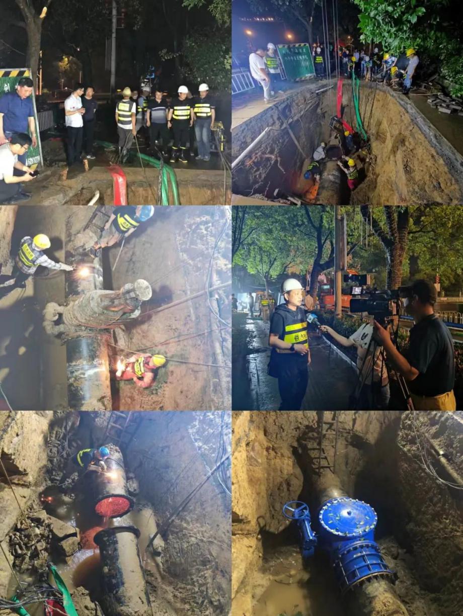 夜幕降臨,搶修現(xiàn)場(chǎng)熱火朝天,公司領(lǐng)導(dǎo)們與搶修人員共同奮戰(zhàn),安排部署搶修設(shè)備、物資。晚上21點(diǎn),天氣突變,面對(duì)突如其來(lái)的降雨,搶修人員拿起雨衣分成兩組,立馬趕往施工地點(diǎn),各盡其職,分頭行動(dòng),冒雨維修,閘門(mén)更換、干管搶修工作齊頭并進(jìn),有序展開(kāi)。