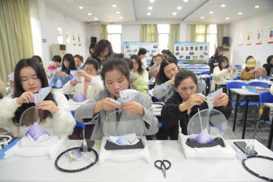 女職工們或是專心注入細沙,或是嘗試用多種顏色細沙混合放入,細沙因為力度、數(shù)量的不同,顯現(xiàn)出形態(tài)各異、造型別致的形狀。大家認真地投入自己的創(chuàng)作中,不時欣賞著身邊人的畫作,精心設計間,“橫看成嶺側成峰,遠近高低各不同”,翻轉玻璃,彩色石沙在兩片玻璃間緩緩流動,慢慢沉淀成另外一副模樣,這正是流沙畫的魅力所在。