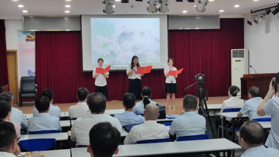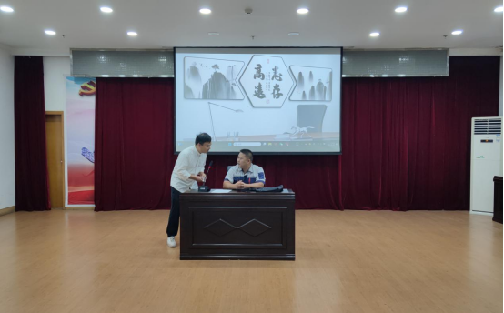 在講廉潔理念環(huán)節(jié),觀看廉潔微視頻《車輪下的腐敗》和誦讀《愛蓮說》清廉詩篇。四名職工緊密結(jié)合“污水變清水”的實際業(yè)務,自編自導自演了一部廉潔從業(yè)情景劇。他們以身邊人為原型,演繹身邊事,生動形象地教育引導全體員工要知敬畏、存戒懼、守底線,共同營造風清氣正的工作氛圍。